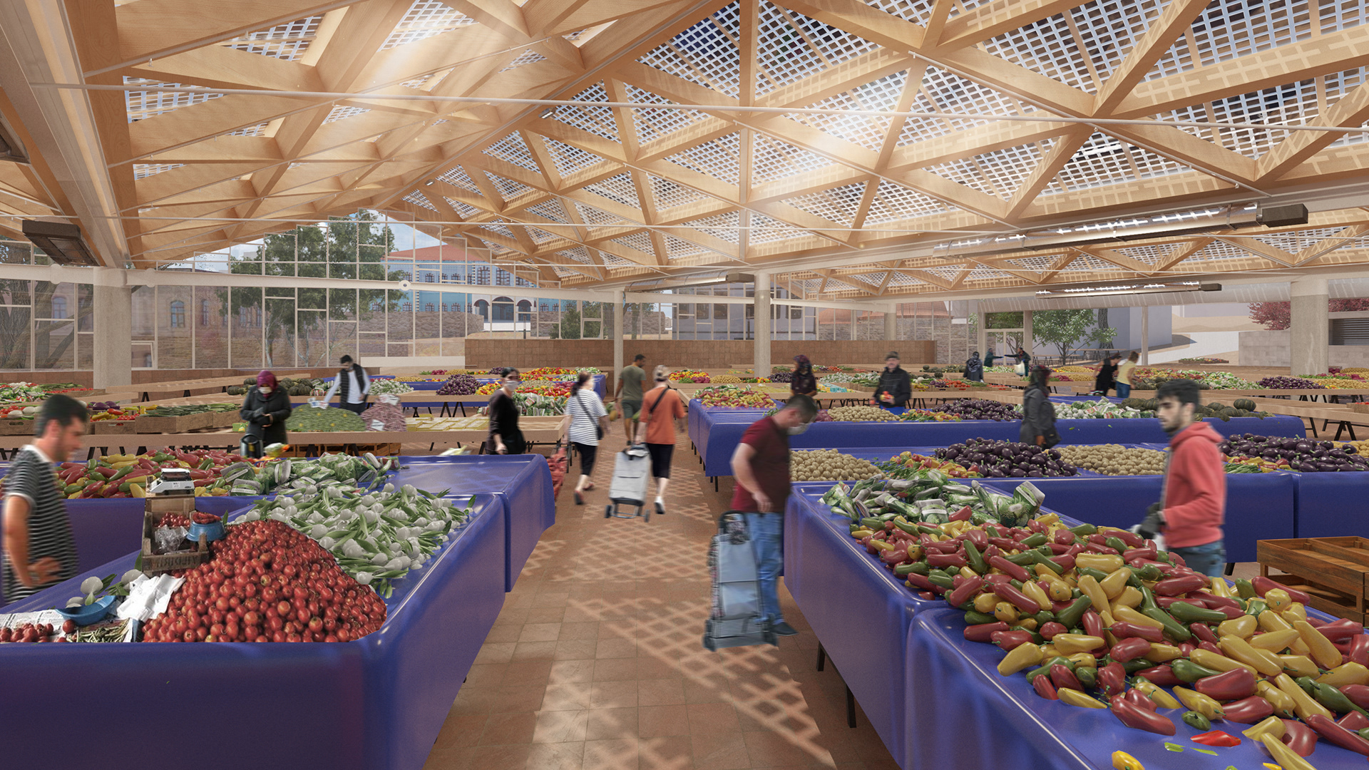 For centuries weekly life of Kütahya's residents includes the weekly one-day markets. In the historic civic center. This timeless function of a civic marketplace is integral to daily life, is part of the civic identity, and is to be realized in the civic landmark for 21st century urban culture. With a sloping terrain the permenant marketplace's stone base is nestled into the earth with multiple entry points to the flows of pedestrians. The upper level creates a continues public space with the block's streets and is protected from wind, rain, snow and noise with a canopy which enables the sunlight to come through as well as be harvested for energy. The underground levels will offer parking within the historic core.