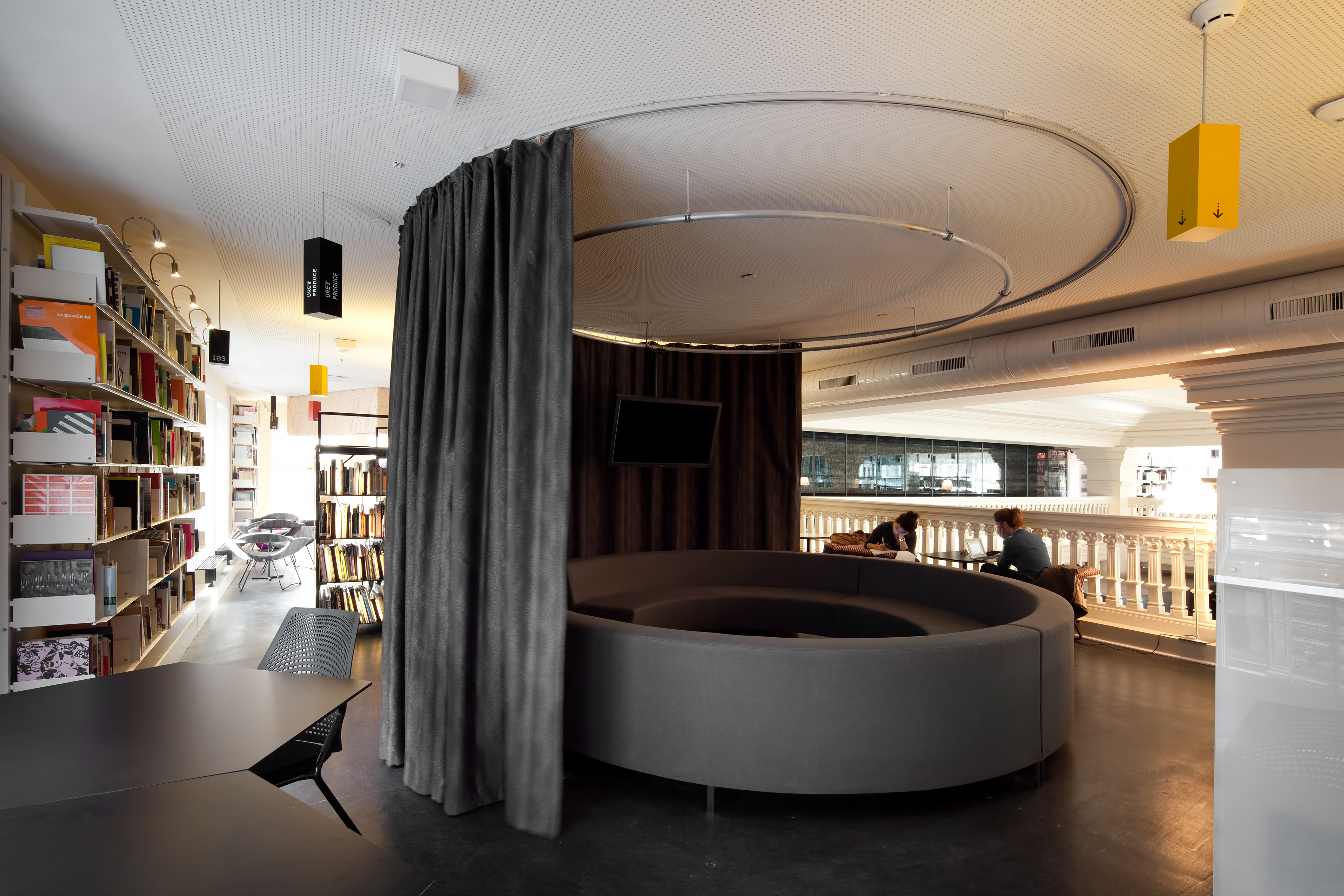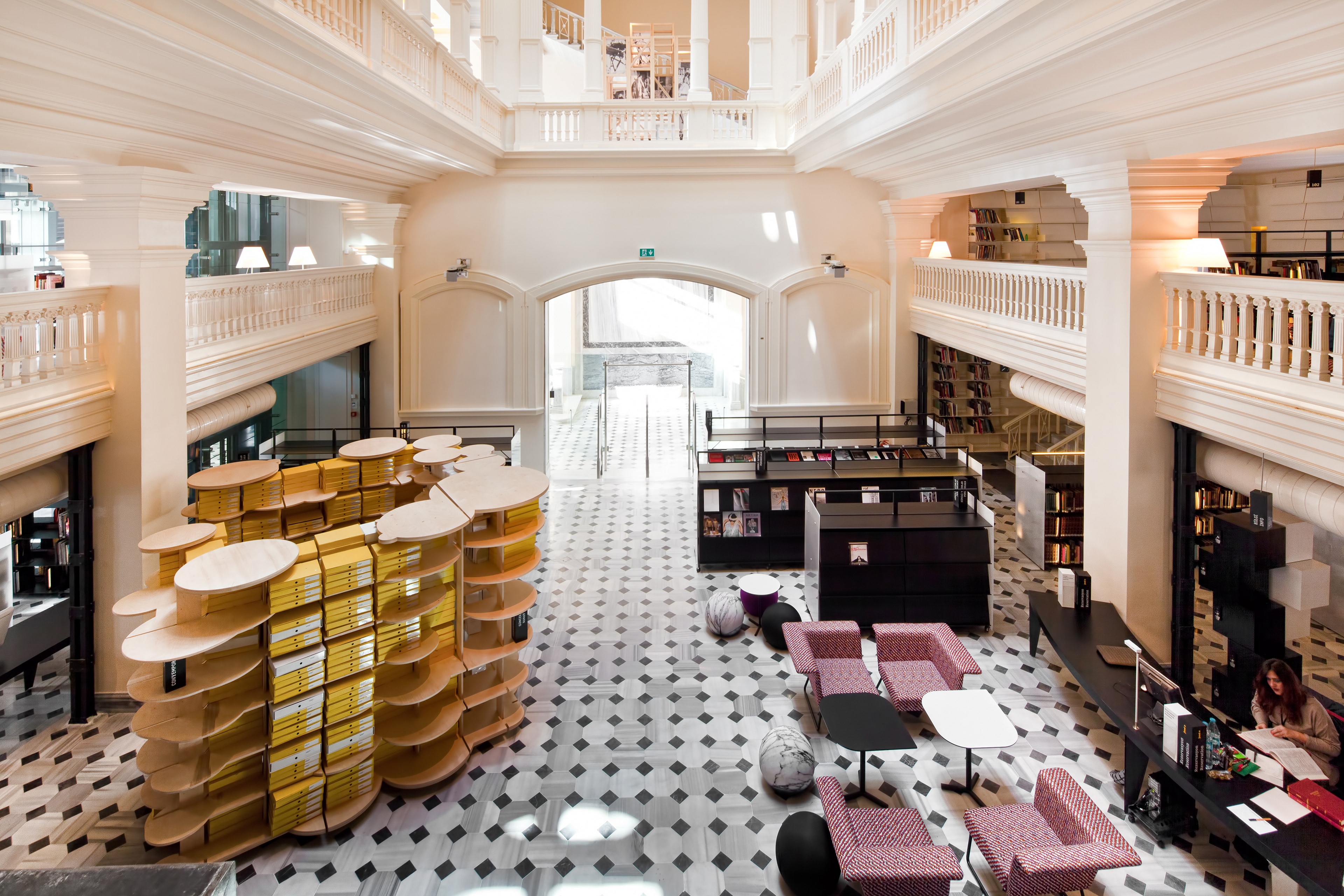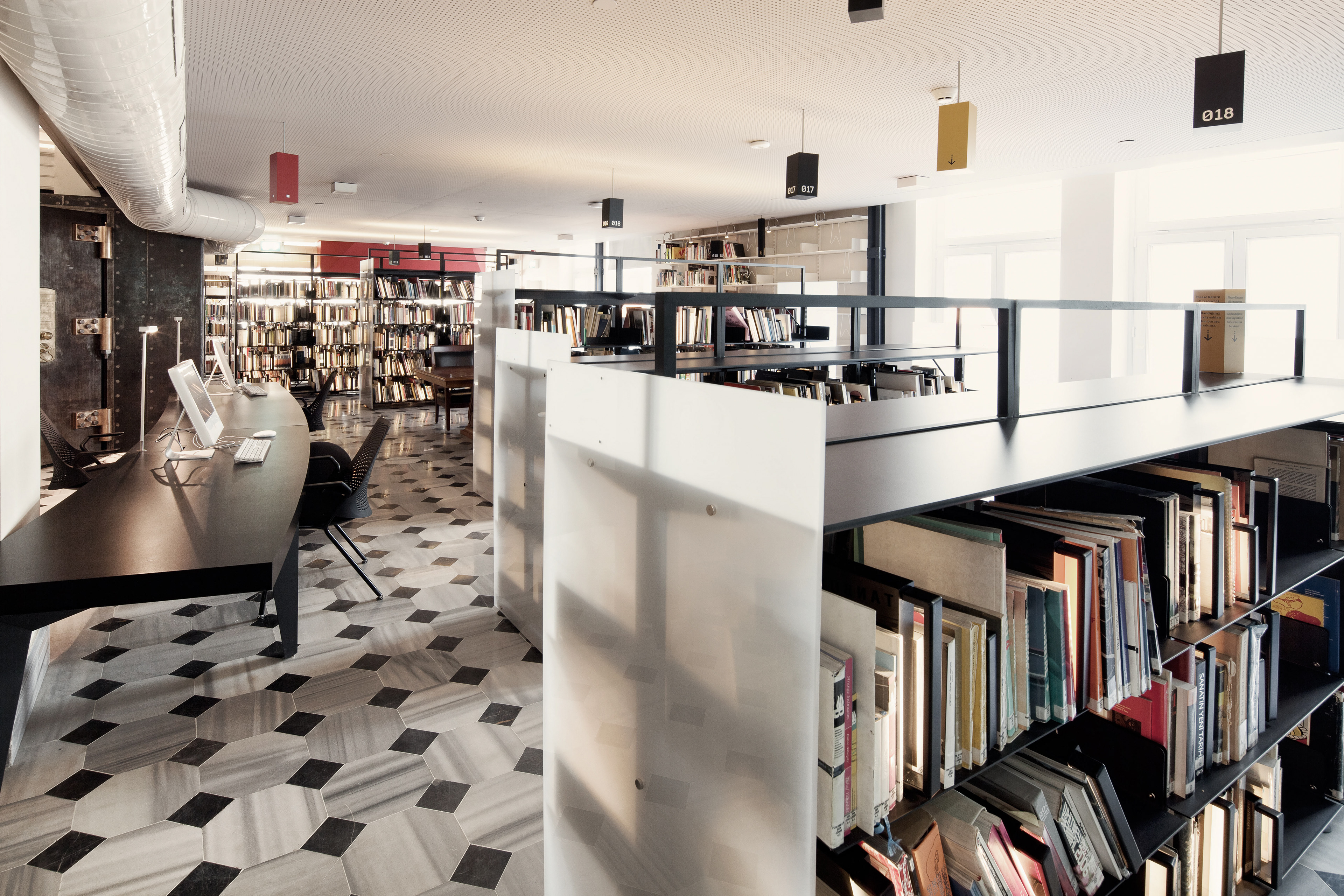 Provicator for Discussion & Ecclectisism The interior design for SALT research set in the atrium of the historic Ottoman Bank building was envisioned as a public tool and a vehicle to research, exchange, engage, and create content, but also as a distinct place-based steward of contemporary cultures. Digitally sampling the cities and the building is unique in our process of architectural design. Sampling the city through multi-modal digital platforms to create and compose narratives; then spatially re-collaged relations to create the 'sense' of place. Our design narratives are most clearly articulated in the 3 distinct objects: A) site + sound, B) light + aperture, and C) the atrium's 19th century ornament + view. The design approach pursued both millenniums of the 19th C historic building uniqueness and the new 21st C library in a choreographed composition. Our firm's sound sampling software, Adobe Illustrator's scripting platform, and Rhino's parametric surface mapping underpinned the concept to realization.