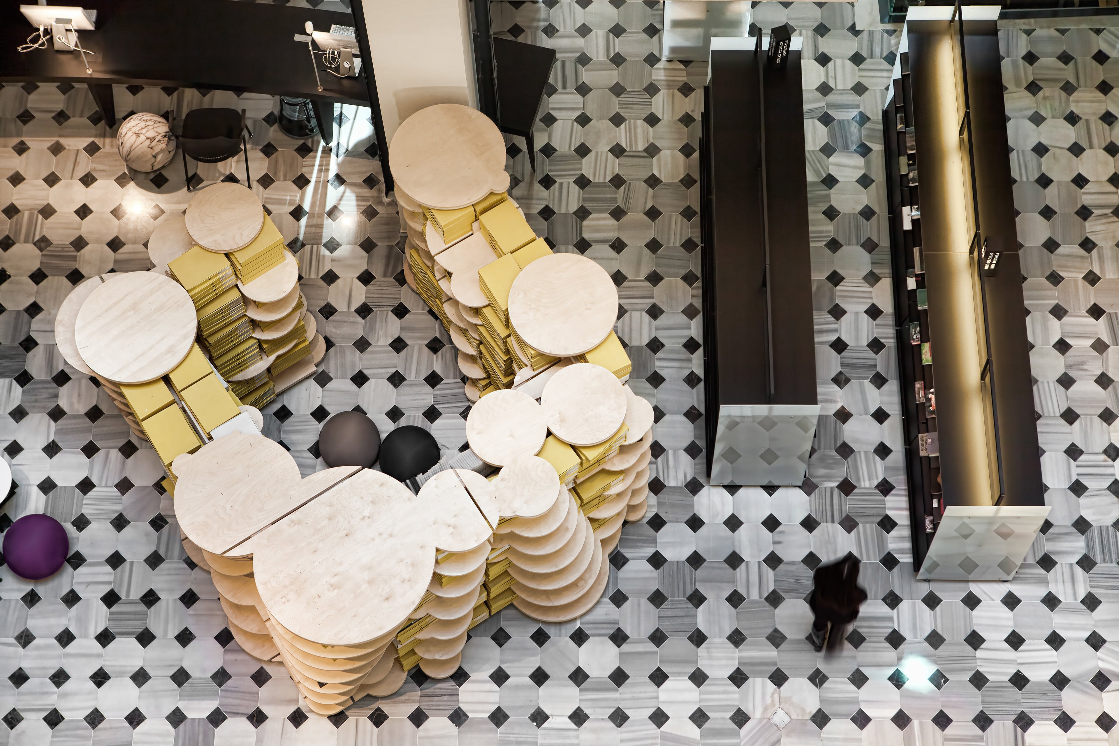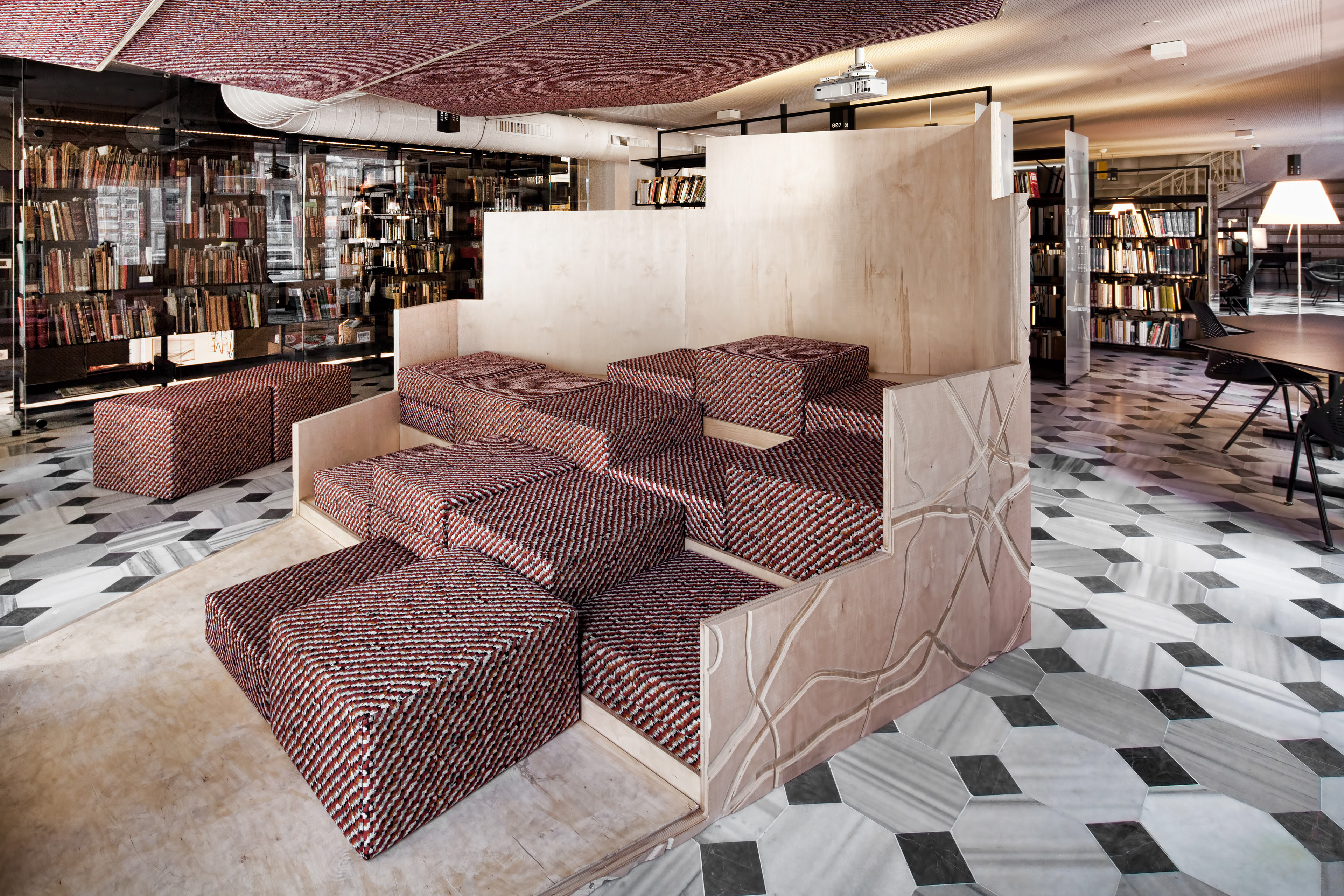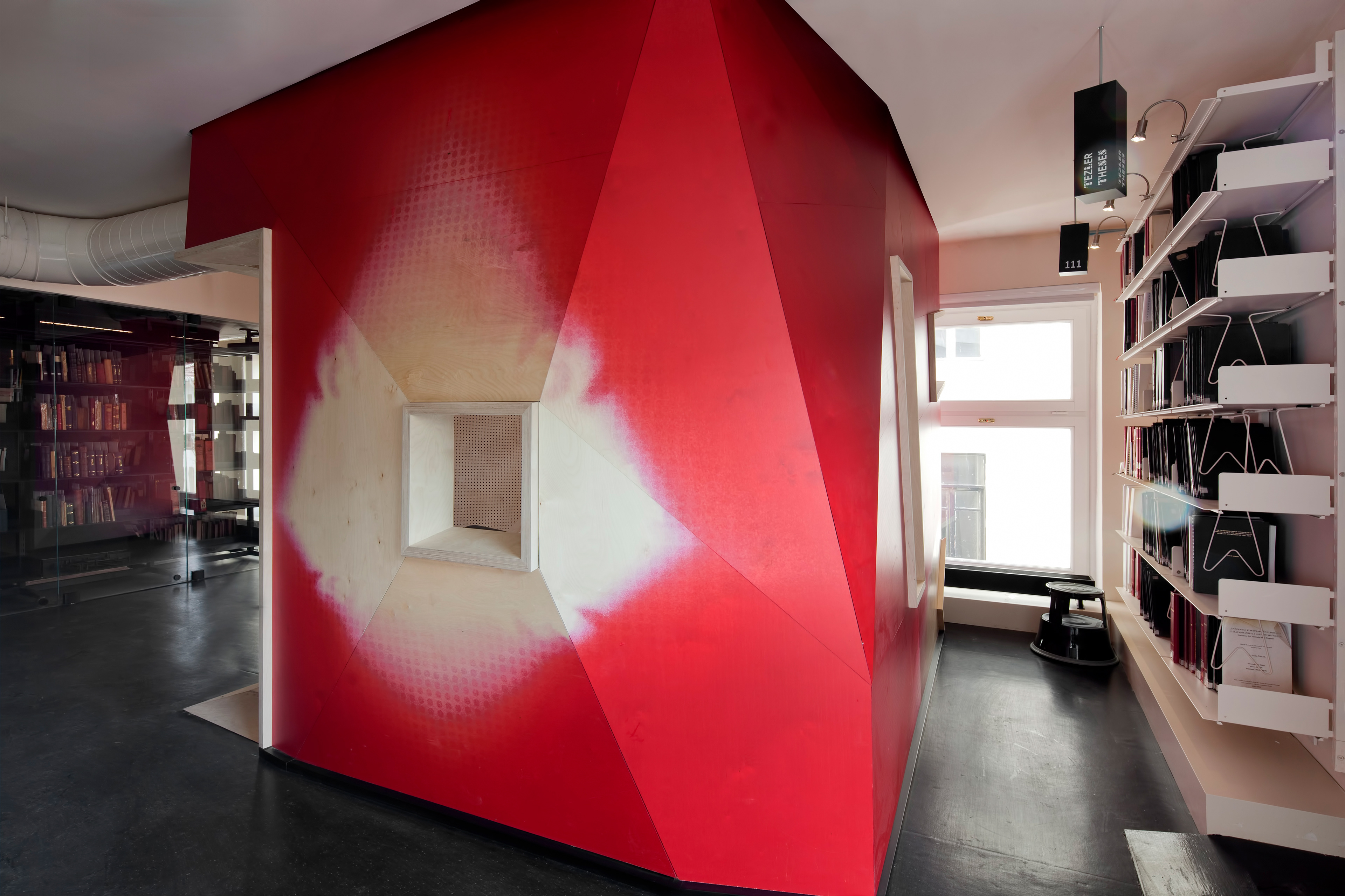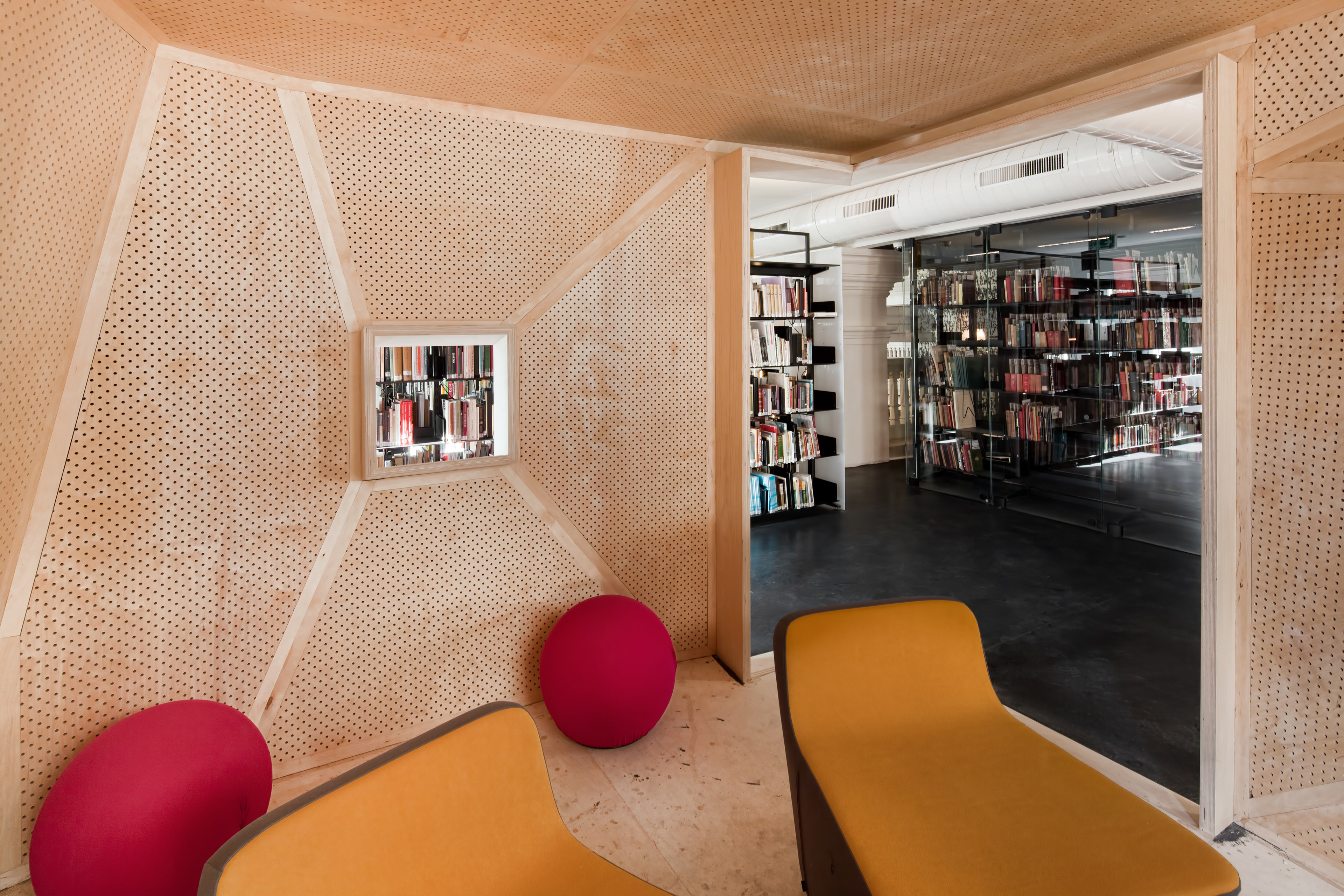 Provicator for Discussion & Ecclectisism The interior design for SALT research set in the atrium of the historic Ottoman Bank building was envisioned as a public tool and a vehicle to research, exchange, engage, and create content, but also as a distinct place-based steward of contemporary cultures. Digitally sampling the cities and the building is unique in our process of architectural design. Sampling the city through multi-modal digital platforms to create and compose narratives; then spatially re-collaged relations to create the 'sense' of place. Our design narratives are most clearly articulated in the 3 distinct objects: A) site + sound, B) light + aperture, and C) the atrium's 19th century ornament + view. The design approach pursued both millenniums of the 19th C historic building uniqueness and the new 21st C library in a choreographed composition. Our firm's sound sampling software, Adobe Illustrator's scripting platform, and Rhino's parametric surface mapping underpinned the concept to realization.
